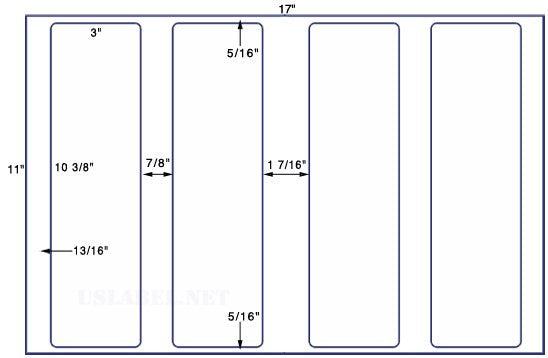 This is a 3'' x 10 3/8'' - 4 up label on a 11'' x 17'' sheet - 4,000 labels. Now available in more than 39 different label stocks. Custom Flood Coating and scoring available.Make your selection under Label & Adhesive Options.