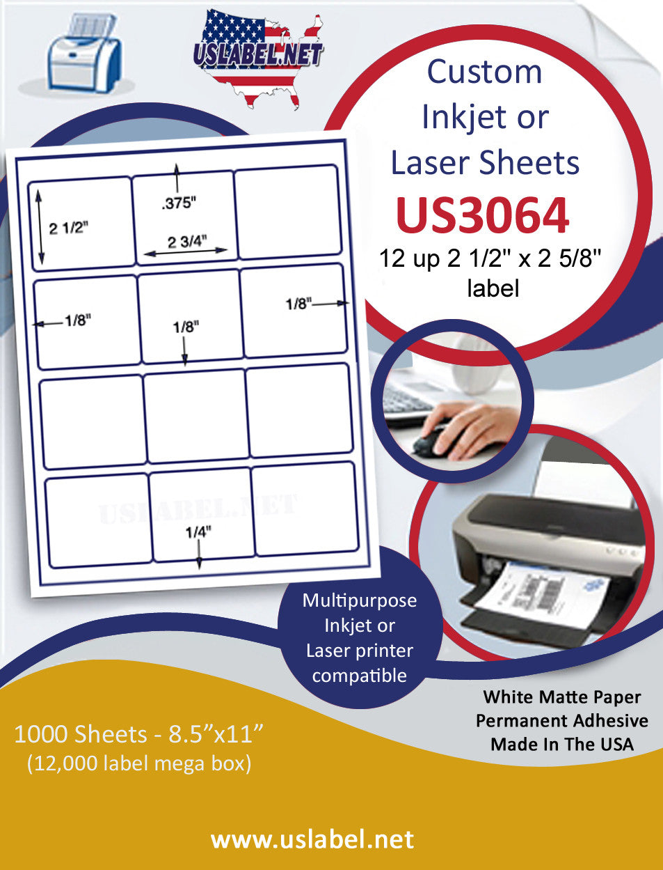 This is a 12 up 2 1/2" x 2 5/8"label on a 8 1/2" x 11" inkjet or laser sheet.1,000 sheet box = 12,000 Labels. Now available in more than 39 different label stocks. Make your selection under the Label & Adhesive Options.US3064-2 3/4''x2 1/2''-12 up on a 8 1/2" x 11" label sheet.