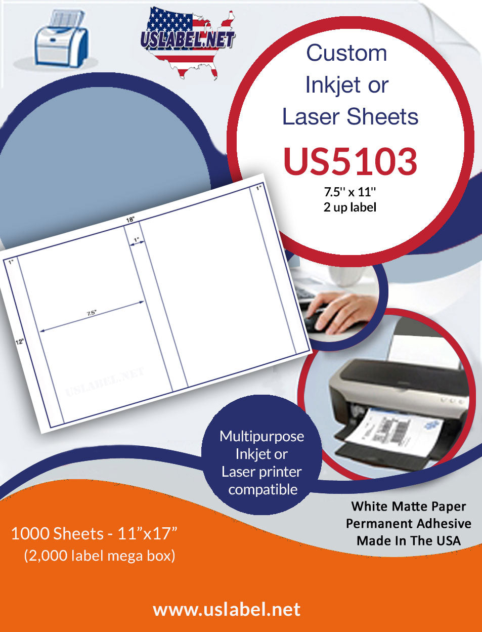 The US5103 - 2 up 7.5'' x 11'' label on a 11'' x 17''sheet. is the high quality product is what you need, when you need it and will keep fresh a very long time good value.