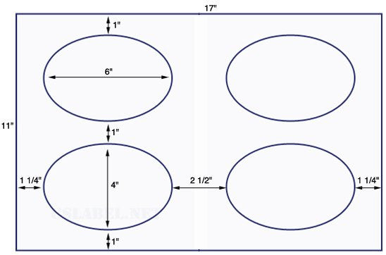 This is a 4'' x 6'' Oval 4 up on a 11'' x 17'' sheet - 4,000 labels. Now available in more than 39 different label stocks. Custom Flood Coating and scoring available. Make your selection under Label & Adhesive Options.