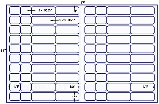This is a 1.3" x .9625" and 2.7" x .9625" - 80 up label on a 11'' x 17'' sheet - 80,000 labels. Now available in over 39 different label stocks. Make your selection under Label & Adhesive Options.
