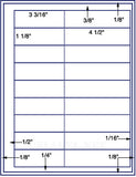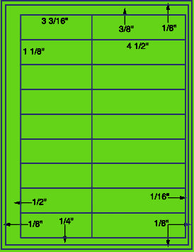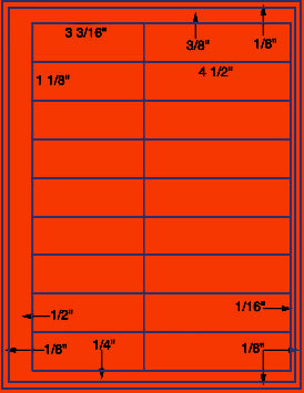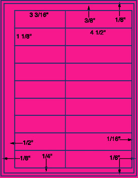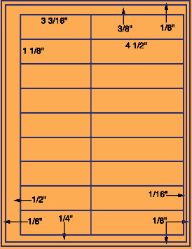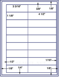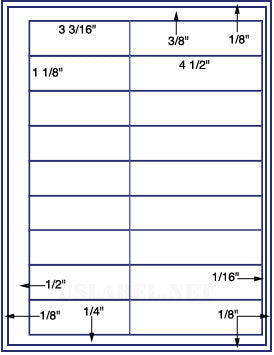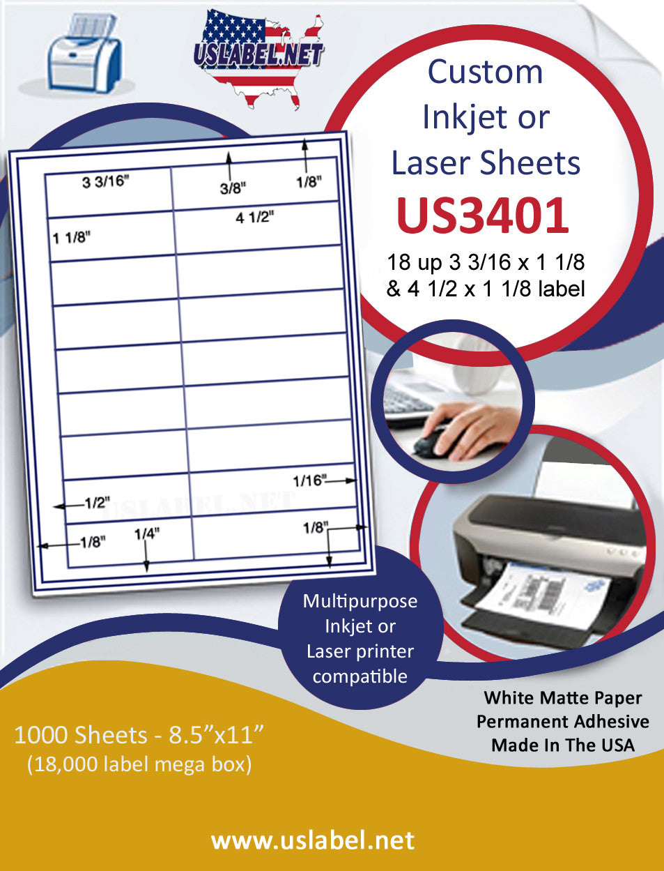 This is a 18 up 3 3/16" x 1 1/8" & 4 1/2" x 1 1/8" label on a 8 1/2" x 11" inkjet or laser label sheet 1,000 sheet box = 18,000 Labels. Now available in 39 different label stocks. Make your selection under the Label & Adhesive Options.US3401-3 3/16''x1 1/8''-18 up on a 8 1/2" x 11" label sheet.