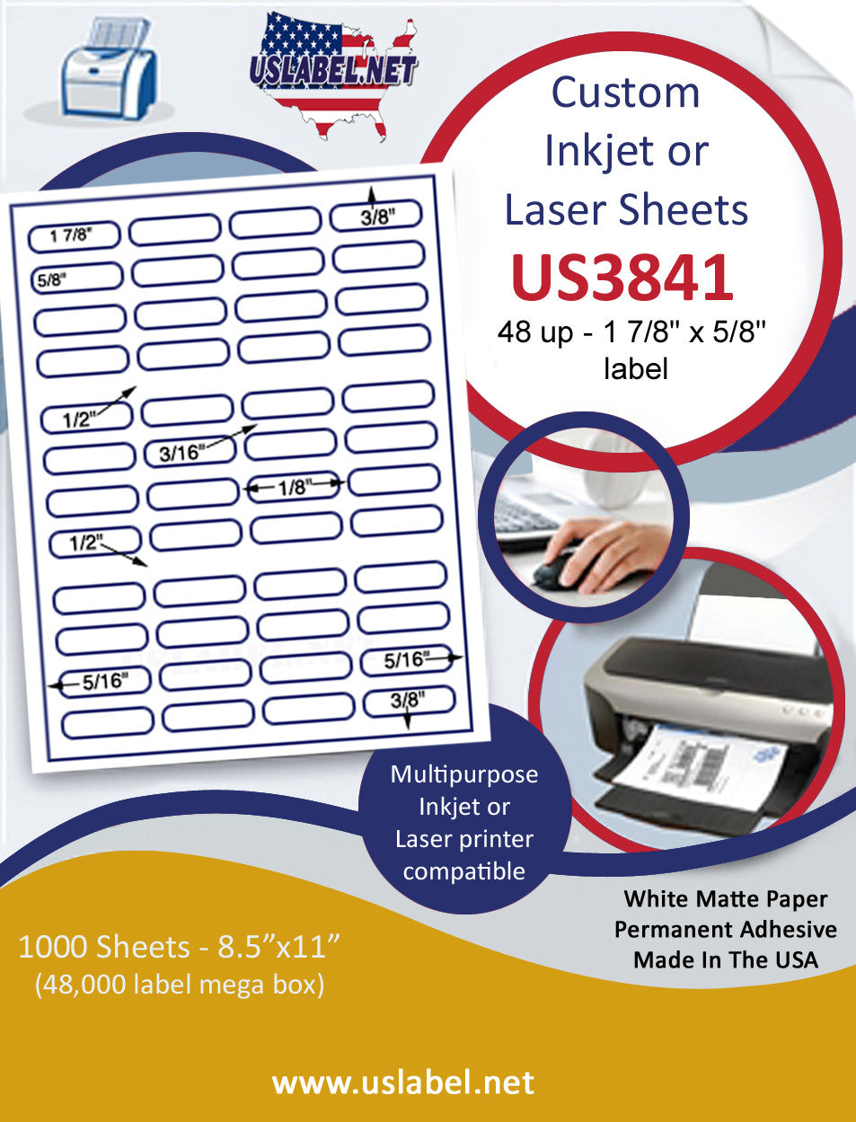 This is a 48 up - 1 7/8" x 5/8"label on a 8 1/2" x 11" inkjet or laser label sheet.1,000 sheets = 48,000 labels. Now available in over 39 different label stocks.Make your selection under Label & Adhesive Options.US3841-1 7/8'' x 5/8''-48 up on a 8 1/2" x 11" label sheet.