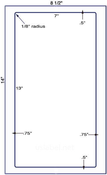 - Sheet Size: 8 1/2" x 14" with a 7" x 13" label die cut with rounded corners