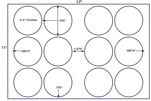 This is a 3.5'' Diameter circle - 12 up label on a 11'' x 17'' sheet - 12,000 labels. Now available in more than 39 different label stocks. Custom Flood Coating and scoring available. Make your selection under Label & Adhesive Options.