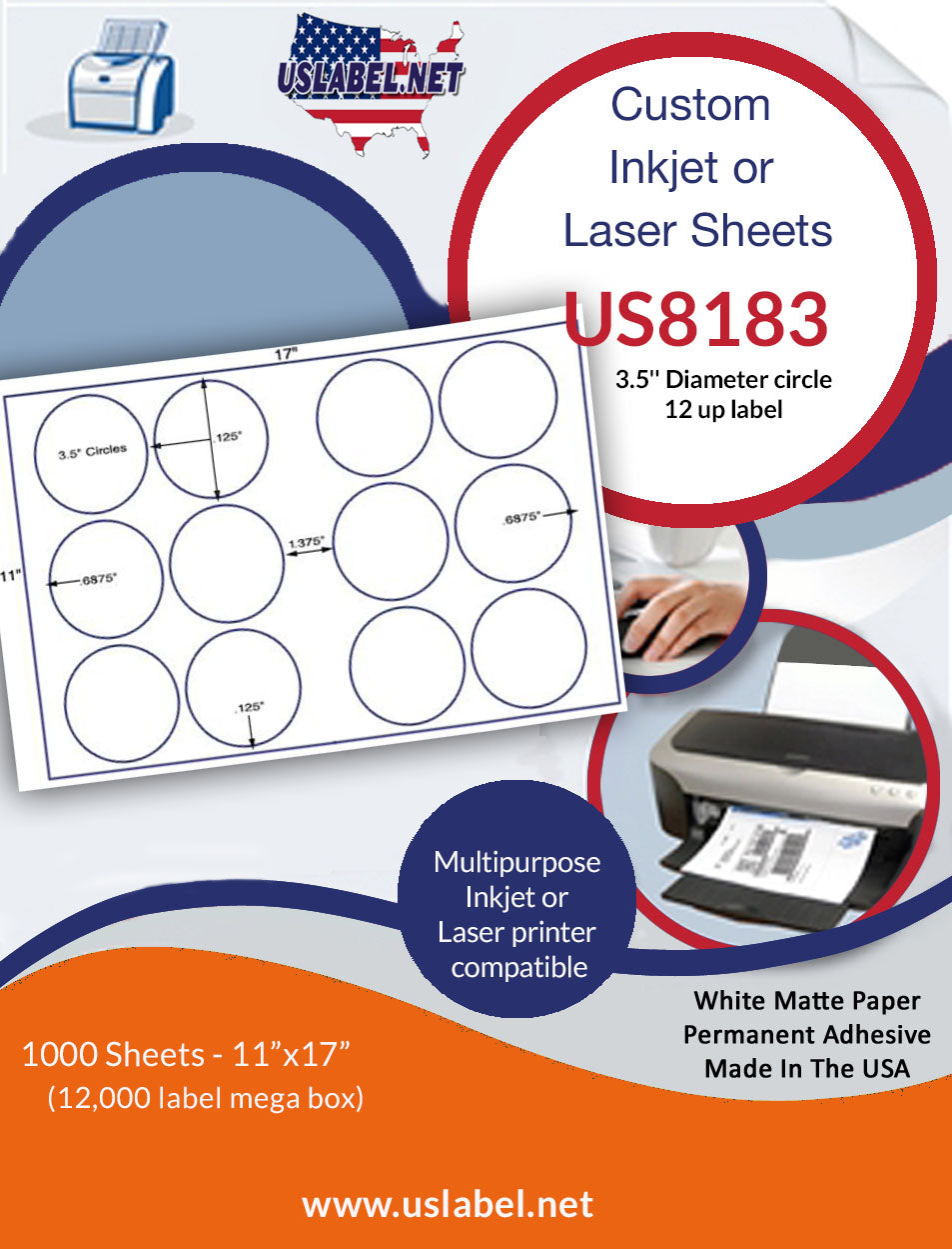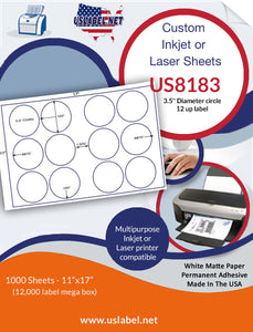 The US8183-3.5''Diameter circle 12 up on a 11''x17''sheet. is made in America and we hope this item is what you're looking for.