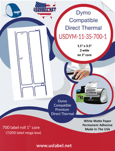 This is a Dymo Compatible Premium Direct Thermal 1.1" x 3.5" label 2 wide 700 Labels on a roll on a 1" core with permanent adhesive - 10 rolls in a box = 7,000 Labels. Compatible with Dymo LabelWriter 4XL thermal printers.