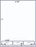 This is our 8.5" x 11" shipping form 3 labels centered at bottom. Each label measures 2 9/16" wide by 1" high. Labels are 3/8" from left and right and 3/8" from bottom with no space between labels. Compatible with most laser and inkjet printers 24# white bond. Label comes with a permanent adhesive. Standard cut-sheet form size Paper: White 24# Bond 1,500 Sheets in a box.Weight 26lbs. Buy in bulk and save 20% on 68 boxes (102,000 sheets)on a pallet and free shipping to the lower 48 states free shipping to the lower 48 states. Allow extra time for delivery of full pallet loads.