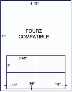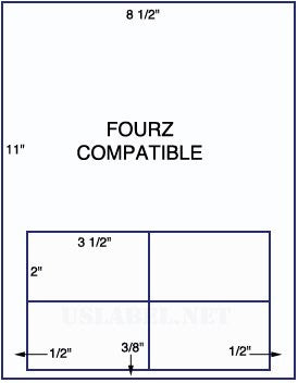 This is our 8.5" x 11" or 8 1/2" x 14" Fourz compatible shipping labels.Four labels centered at bottom. Each label measures 3 1/2" wide by 2" high. Labels are 3/4" from left and right and 3/8" from bottom with no space between labels. Compatible with most laser and inkjet 24# white bond. Label comes with a permanent adhesive. Standard cut-sheet form size Paper: White 24# Bond 1,500 Sheets in a box.Weight 26lbs or 30 lbs for 8 1/2" x 14". Buy in bulk and save 20% on 68 boxes (102,000 sheets)on a pallet and free shipping to the lower 48 states free shipping to the lower 48 states. Allow extra time for delivery of full pallet loads.
