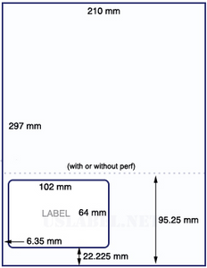 Label comes with a permanent adhesive. With or without perforation. Standard cut-sheet size Paper: White 24# Bond 1,500 Sheets in a box.Weight 36lbs.US102641-A4 210mm x 297mm w 1-102mm x 64mm RC label.