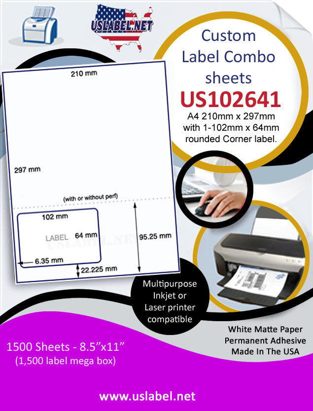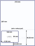 This is our European A4 Size Integrated label sheet 210mm x 297mm with 1 -102mm x 64mm rounded Corner label 6.35mm from the left and 22.225mm from bottom of the sheet.Compatible and with most laser and inkjet printers.