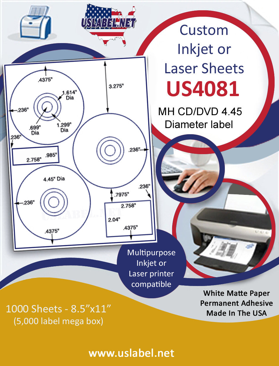 This is a MH CD/DVD 4.45 Diameter label.Now available in over 4 different types.Make your selection under the Label & Adhesive Options. For complete Technical Specifications of our label products please email: rh@uslabel.netUS4081-MH-DVD 4.45'' on a 8/1/2"x 11" label sheet.