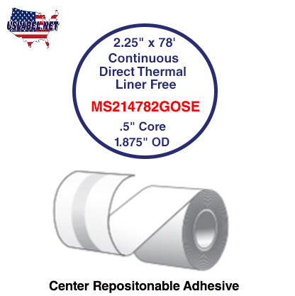 This is a 2.25'' x 78' Liner free Repositionable Direct Thermal Roll on a .5'' Core - 1.875''OD 55 Gauge/gms on roll #15 Base 2 go Center Repositionable adhesive with 72 rolls in the box = 5,616 lineal feet in the box. This continuous direct thermal strip does not require a ribbon and ships same day next business day.
