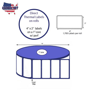 This is a 4'' x 2'' Direct Thermal label on a 1'' core 5'' OD with 1700 labels on roll with 12 in the box = 20400 labels in the box. This label does not require a ribbon and ships same day next business day.