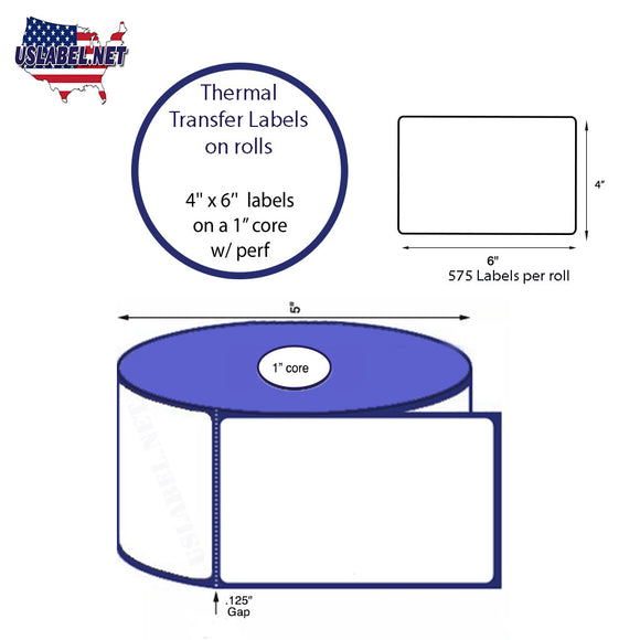 This is a 4'' x 6'' Thermal Transfer label on a 1'' core with 5'' OD with 575 labels on a roll with12 rolls in the box = 6900 labels in the box. This label requires that you use a ribbon and ships same day next business day.