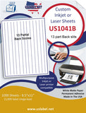 8 1/2'' x 11'' - 13 part Back Scores on a 8 1/2" x 11" Sheet. Works with all Laser and Inkjet Printers as well as can be offset printed and digital printed.Make your selection from over 39 different label stocks under Label and adhesive options.1,000 sheets in the box 13,000 labels.US1041B8.5'' x 11'' with 13 part Back Scores label sheet.