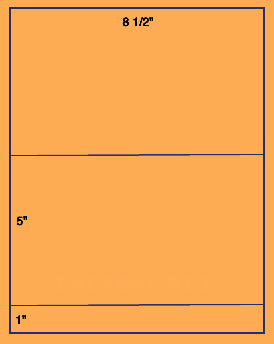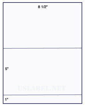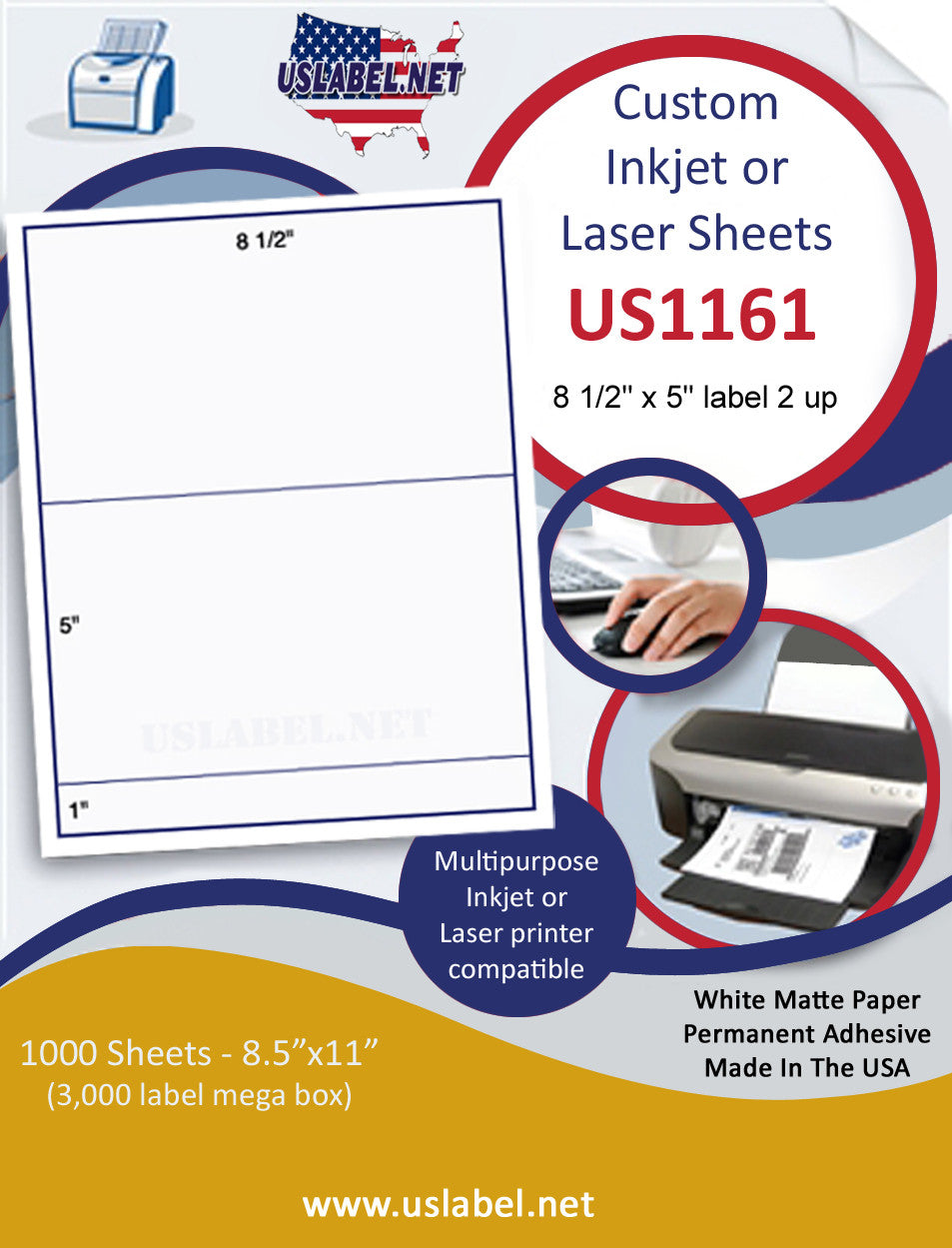 This is a 8 1/2" x 5" label 2 up with a 1" x 8" label on a 8 1/2" x 11" sheet - 3,000 labels. Works with all Laser and Inkjet Printers as well as can be offset and digital printed. Choose from over 39 options under label and adhesive options.US1161 - 8 1/2'' x 5'' on a 8 1/2" x 11" label sheet.