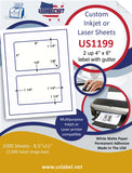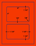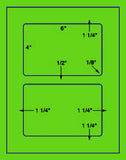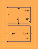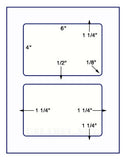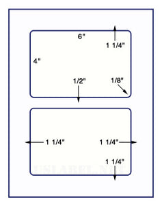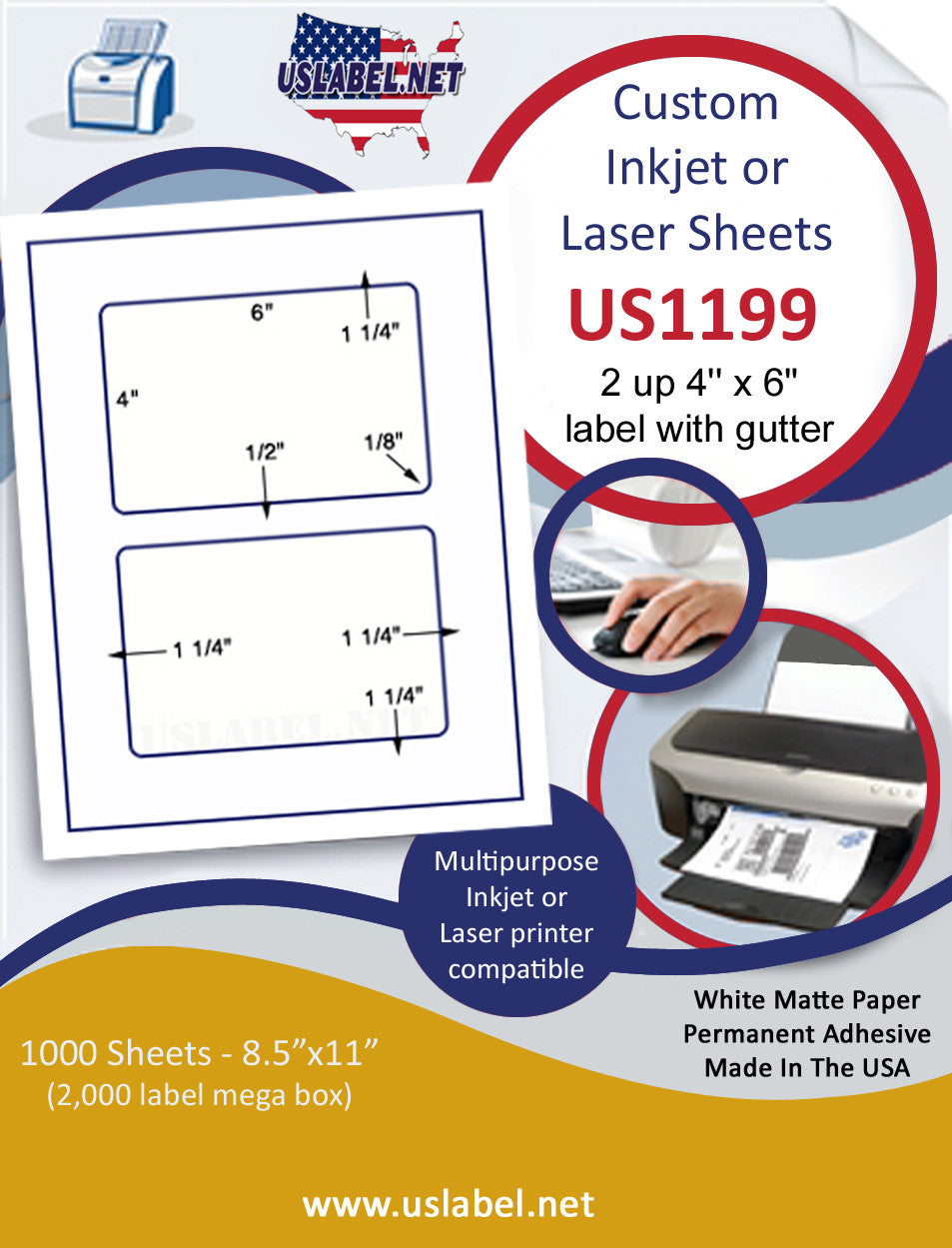 This is a 2 up 4'' x 6" label with gutter on a 8 1/2" x 11" sheet. - 2000 labels. Works with all Laser and Inkjet Printers as well as can be offset printed and digital printed. Choose from over 39 label types under label and adhesive options.US1199 - 4'' x 6''-2 up on a 8 1/2" x 11" label sheet.