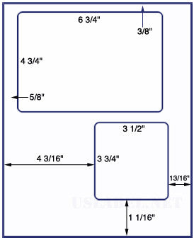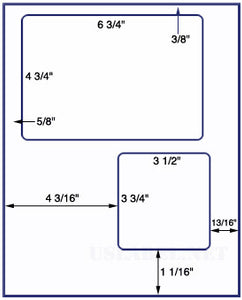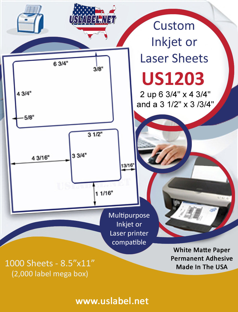 This is a USPS Click & Ship© - 1 up 6 3/4" x 4 3/4" and 1 up 3 1/2" x 3 /3/4" label on a 8 1/2" x 11" sheet. - 2,000 labels. Works with all Laser and Inkjet Printers as well as can be offset printed and digital printed. Choose from over 37 label types under label and adhesive options.US1203-USPS Click & Ship©-2 up -8 1/2"x11" label sheet.