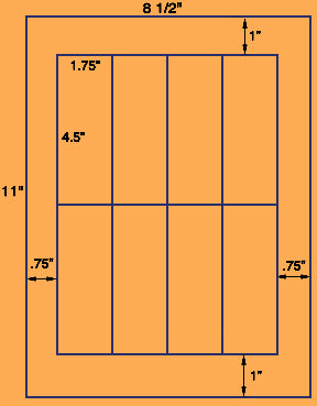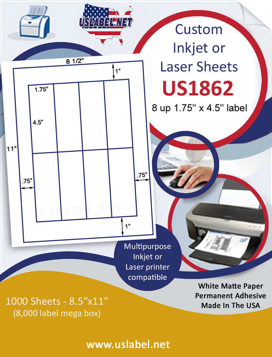 This is a 8 up 1.75'' x 4.5'' label on a 8 1/2" x 11" inkjet or laser sheet. 8,000 labels in the box.Now available in over 39 different label types. Make your selection under the Label & Adhesive Options.US1862-1.75''x4.5"-8 up label on a 8.5" x 11" label sheet.