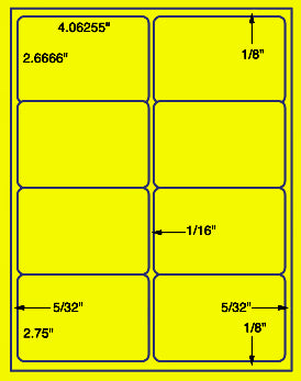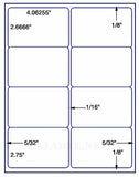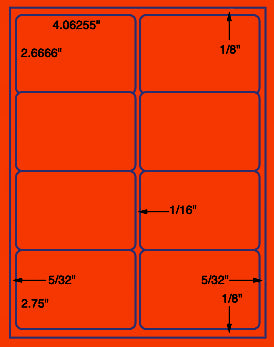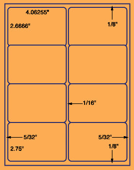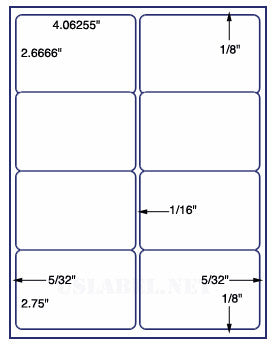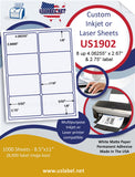 This a 8 up 4.06255'' x 2.67'' & 2.75'' label on a 8 1/2" x 11" inkjet or laser sheet.1000 sheet box = 8,000 Labels. Now available in over 39 different label types. Make your selection under the Label & Adhesive Options. US1902-4.06255''x2.67''&2.75''-8up 8.5" x 11" label sheet.