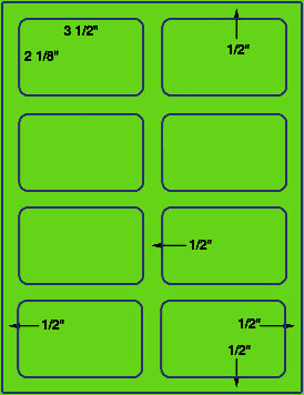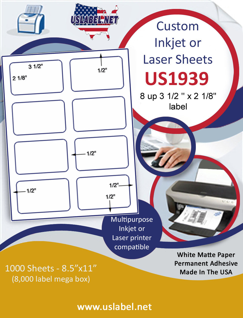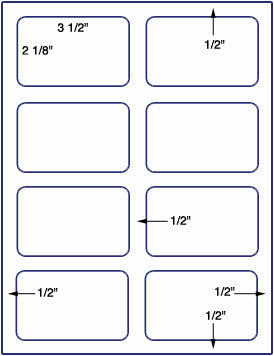 This a 8 up 3 1/2 '' x 2 1/8"label on a 8 1/2" x 11" inkjet or laser sheet. - 1000 sheet box = 8,000 Labels. Now available in over 39 different label types.Make your selection under the Label & Adhesive Options.US1939-3.5''x2.125''-8 up on a 8.5" x 11" label sheet.