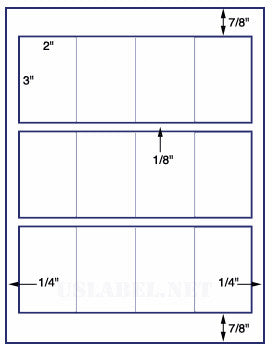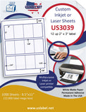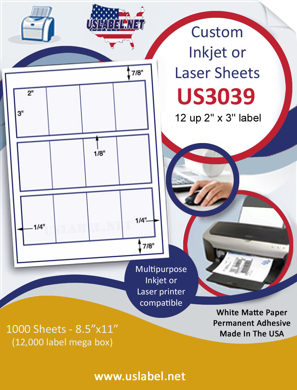 This is a 12 up 2'' x 3'' label label on a 8 1/2" x 11" inkjet or laser sheet 1,000 sheet box = 12,000 Labels. Now available in 39 different label stock types. Make your selection under the Label & Adhesive Options. US3039-2''x3''-12 up on a 8 1/2" x 11" label sheet.