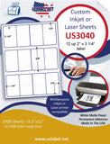 This is a 12 up 2" x 3 1/4" label on a 8 1/2" x 11" inkjet or laser sheet 1,000 sheet box = 12,000 Labels. Now available in more than 39 different label stocks. Make your selection under the Label & Adhesive Options. US3040-2''x3 1/4''-12 up on a 8 1/2" x 11" label sheet.