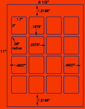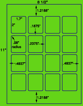 This is a 16 up 1.7'' x 2'' label on a 8 1/2" x 11" sheet - 1,000 sheet box = 16,000 Labels.Make your selection from over 39 different label stocks under Label and adhesive options.US3385-1.7''x2''-16 upon a 8 1/2"x11" label sheet.