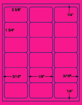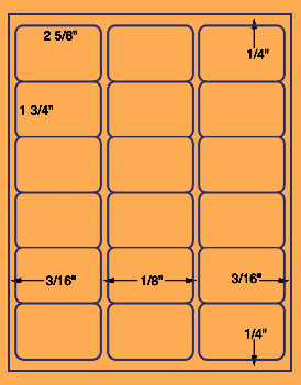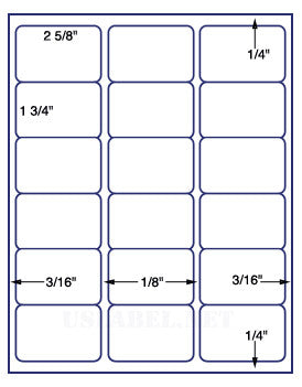 This is a 18 up 2 5/8" x 1 3/4" label label on a 8 1/2" x 11" inkjet or laser label sheet.- 1,000 sheet box = 18,000 Labels. Now available in 39 different label stocks. Make your selection under the Label & Adhesive Options.US3404-2 5/8''x1 3/4''-18 up on a 8 1/2"x11" label sheet.