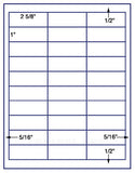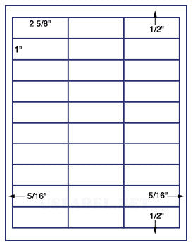This is a 30 up 2 5/8" x 1" Square Corner label on a 8 1/2" x 11" inkjet or laser label sheet.1,000 sheet box = 30,000 Labels. Now available in more than 39 different label stocks.Make your selection under the Label & Adhesive Options.US3600-2 5/8''x1''-30 up Sq.Cr.on a 8 1/2"x11" label sheet.