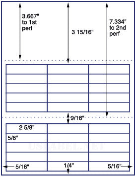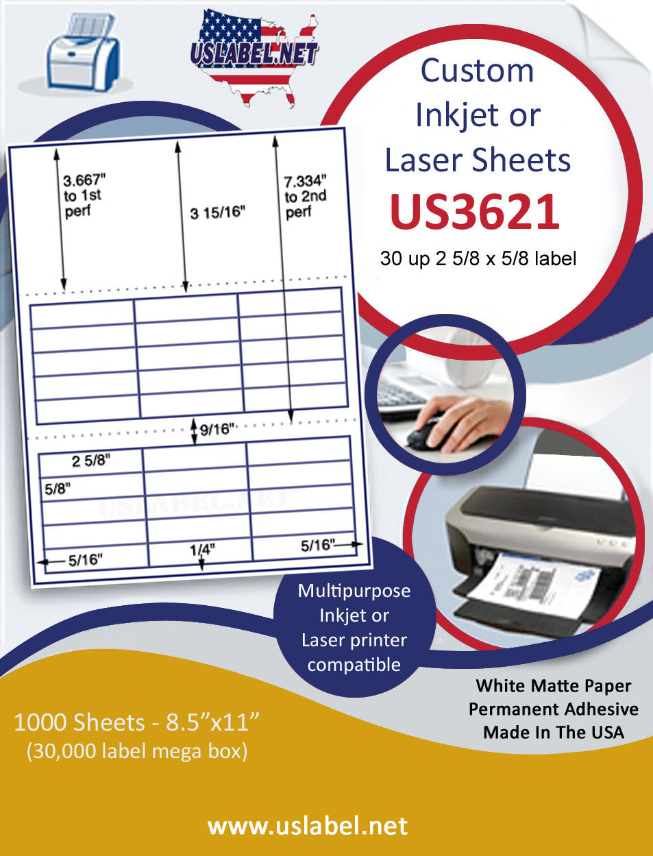 This is a 30 up 2 5/8" x 5/8" label with perfs on a 8 1/2" x 11" inkjet or laser sheet.1,000 sheet box = 30,000 Labels. Now available in 39 different label stocks. Make your selection under the Label & Adhesive Options.US3621-2 5/8'' x 5/8''-30 up on a 8.5"x11" label sheet.