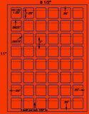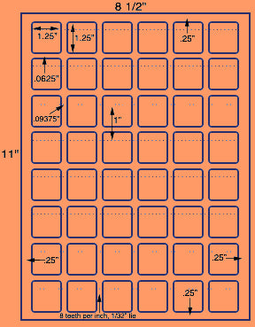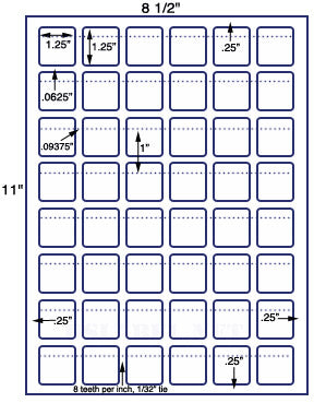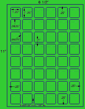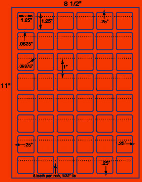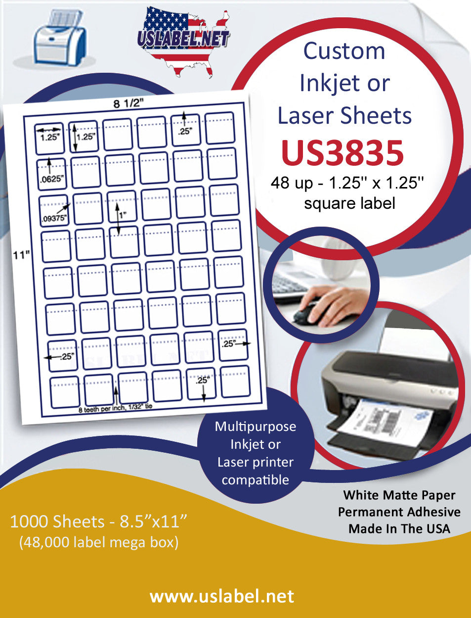 This is a 48 up -1.25'' x 1.25'' square label with perfs on a 8 1/2" x 11" inkjet or laser label sheet.1,000 sheets = 48,000 labels. Now available in over 39 different label stocks.Make your selection under the Label & Adhesive Options.US3835-1.25''x1.25''-48 up on a 8 1/2"x11" label sheet.