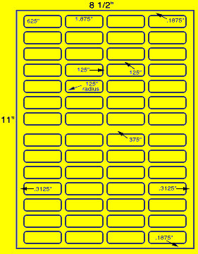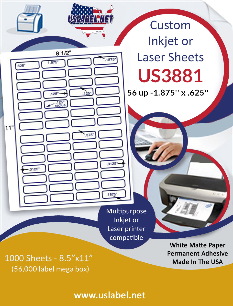 This is a 56 up -1.875'' x .625'' label on a 8 1/2" x 11" inkjet or laser sheet.1,000 sheets = 56,000 labels. Now available in over 39 label stocks.Make your selection under Label & Adhesive Options. US3881-1.875''x.625''-56 up on a 8 1/2"x11" label sheet.