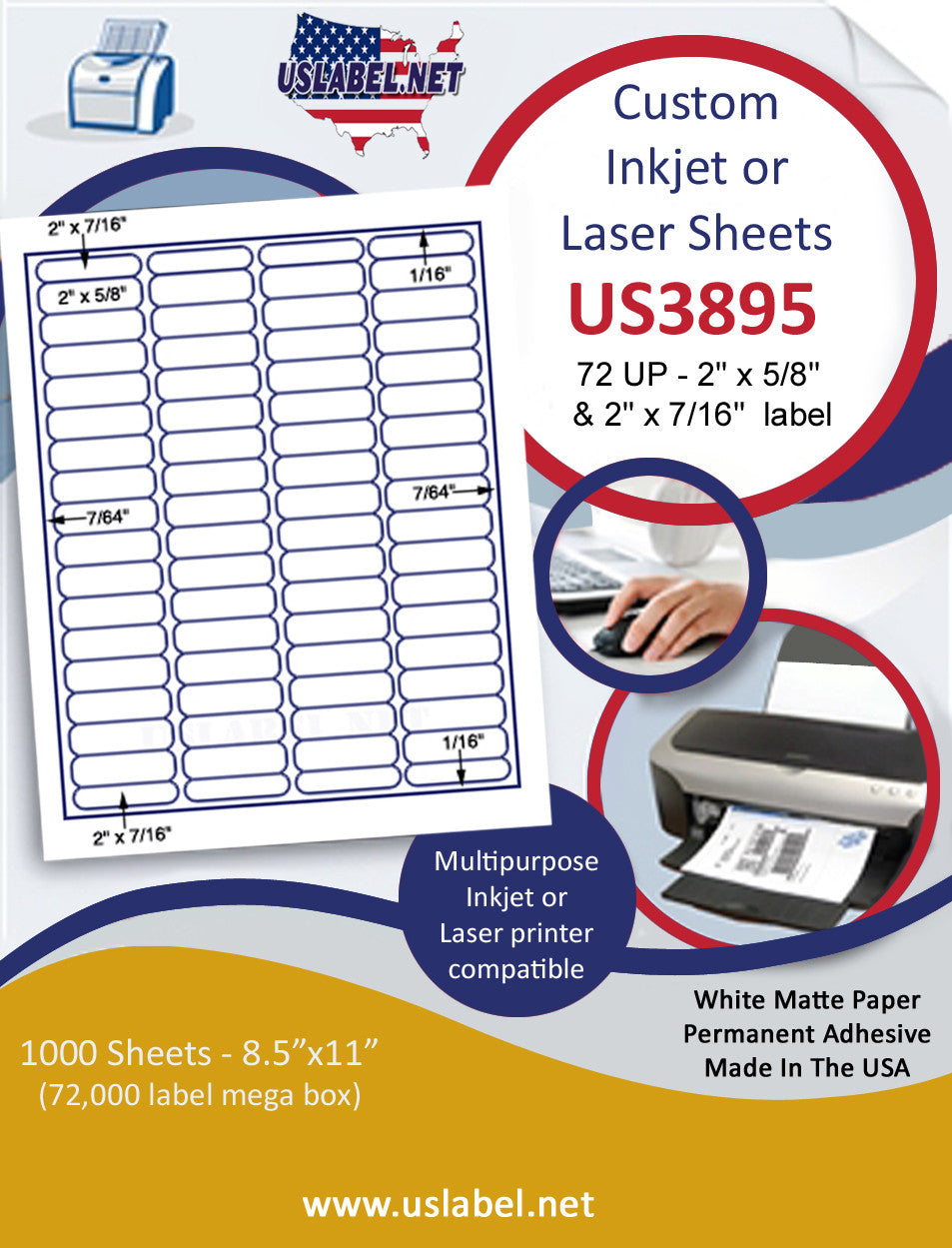 This is a 72 up - 2" x 5/8" & 2" x 7/16" label on a 8 1/2" x 11" inkjet or laser label sheet.1,000 sheets = 72,000 labels. Now available in over 39 different label stocks.Make your selection under Label & Adhesive Options.US3895-2''x 5/8''- 72 up on a 8 1/2" x 11" label sheet.
