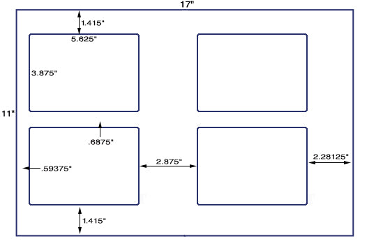 This is a 5.625" x 3.875" - 4 up label with rounded corners on a 11'' x 17''- 4,000 labels. Now available in 39 different label stocks. Custom Flood Coating and scoring available. Make your selection under Label & Adhesive Options.