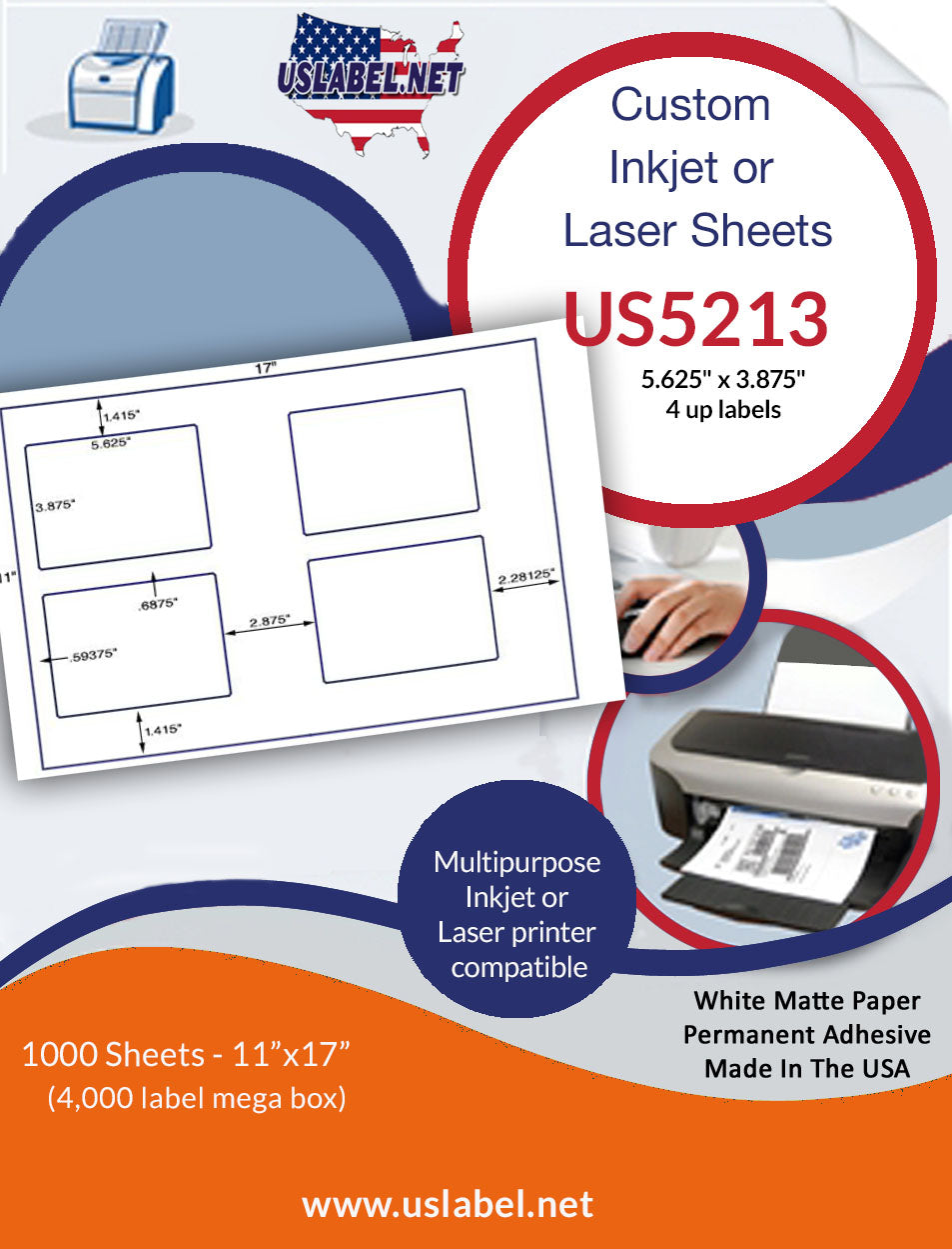 The US5213-4 up-5.625"x3.875" label on a 11'' x 17'' sheet. is made in America and we hope this item is what you're looking for.