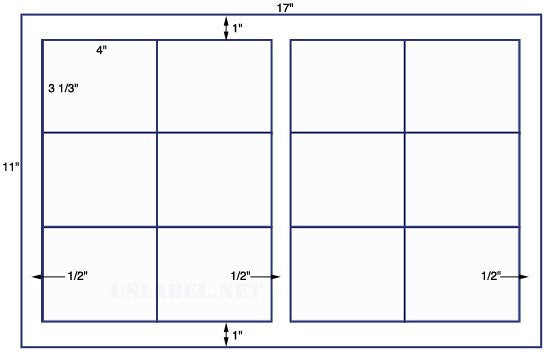 This is a 4'' x 3 1/3'' Square corner 12 up label on a 11'' x 17'' sheet - 12,000 labels. Now available in more than 39 different label stocks. Make your selection under Label & Adhesive Options.