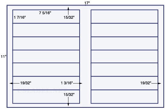 This is a 7 5/16'' x 1 7/16'' - 14 up label on a 11'' x 17'' sheet 14,000 labels. Now available in more than 39 different label stocks. Make your selection under Label & Adhesive Options.