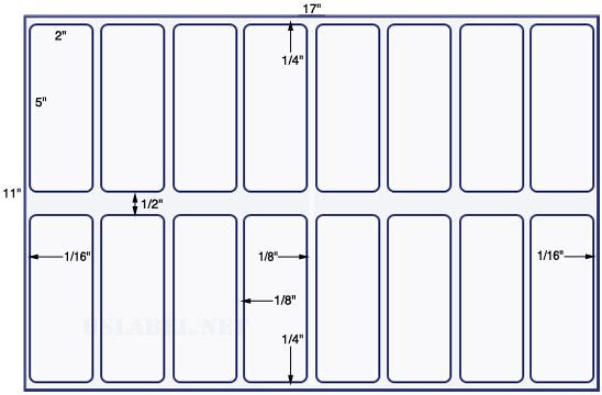 This is a 2'' x 5'' - 16 up on a 11'' x 17'' sheet 16,000 labels. Now available in more than 39 different label stocks. Make your selection under Label & Adhesive Options.