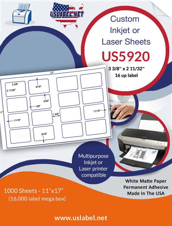The US5920-3 3/8''x2 11/32''-16 up Label on a 11''x17''sheet. is made in America and we hope this item is what you're looking for.