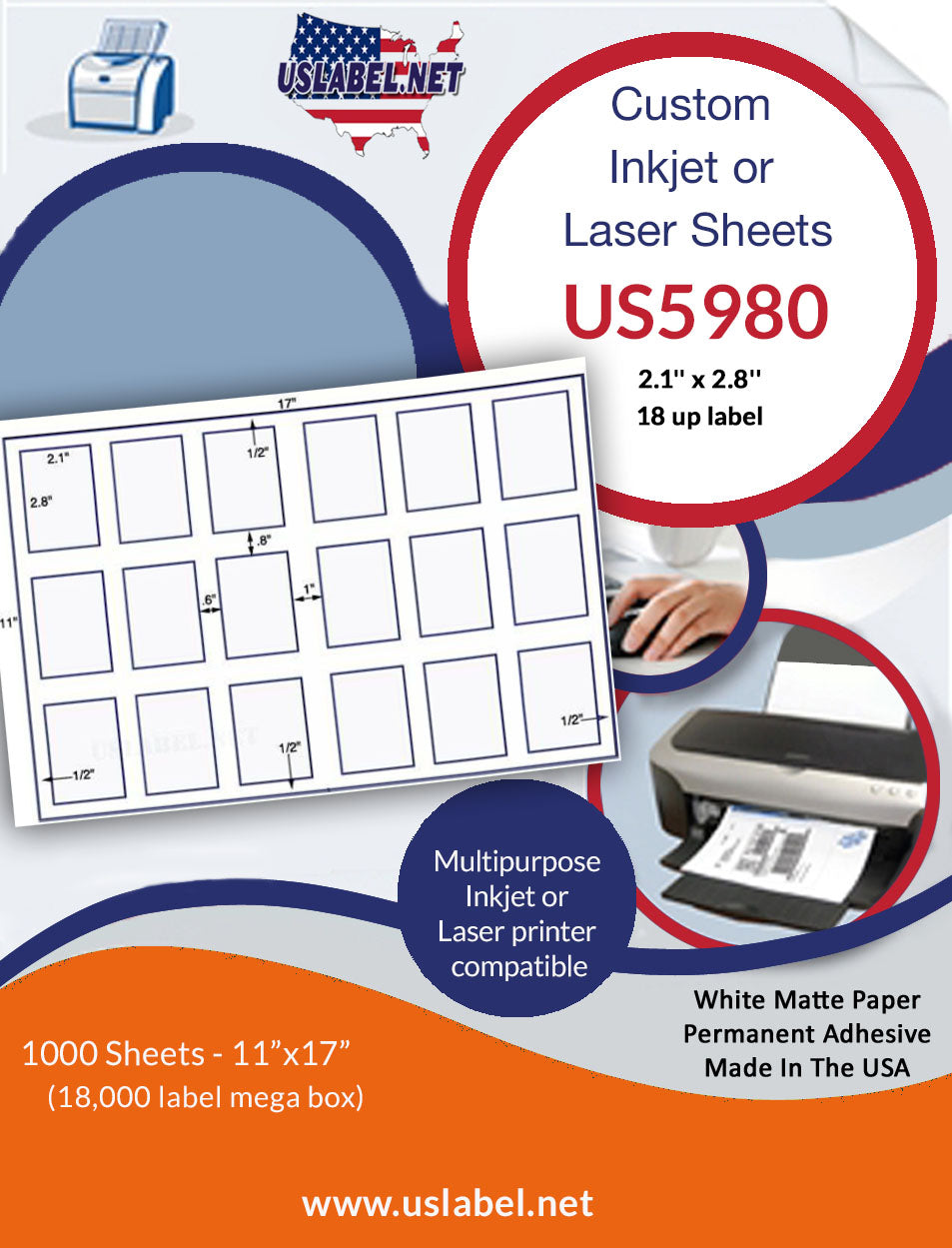 The US5980-2.1'' x 2.8''-18 up label on a 11'' x 17'' sheet. is made in America and we hope this item is what you're looking for.