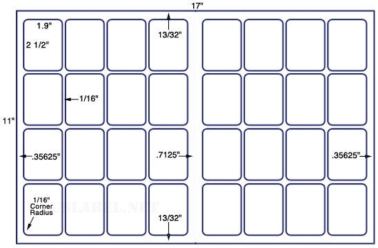 This is a 1.9'' x 2 1/2 with gutters- 32 up label on a 11'' x 17'' sheet 32,000 labels. Now available in over 39 different label stocks. Make your selection under Label & Adhesive Options.