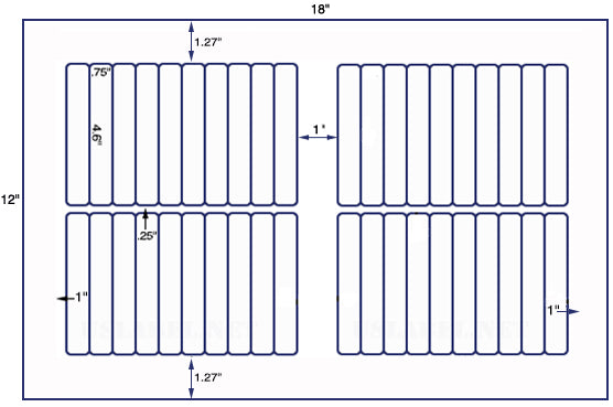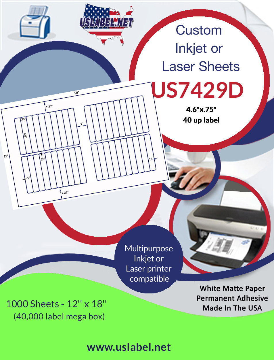 This is a 40 up - 4.6" x .75" label centered on a 12'' x 18'' label sheet.- 40,000 labels in the box available in 9 different label stocks. Packaged in 4 x 250 sheet Packages 500 sheets in 2 boxes. Make your selection under the Label & Adhesive Options.US7429D-40 up 4.6"x.75" label on a 12'' x 18''sheet.