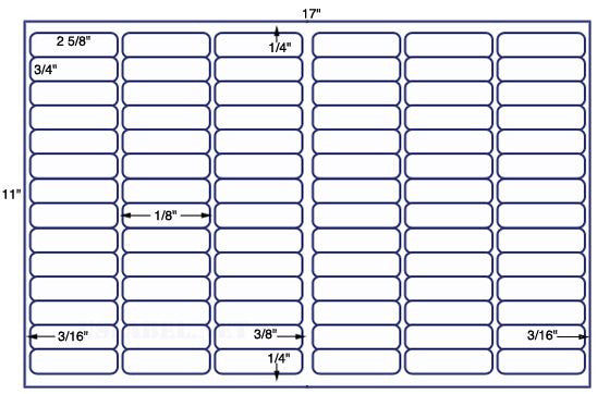 This is a 2 5/8'' x 3/4'' with Rounded Corners - 84 up on a 11'' x 17'' sheet - 84,000 labels. Now available in 39 different label stocks.Make your selection under Label & Adhesive Options.