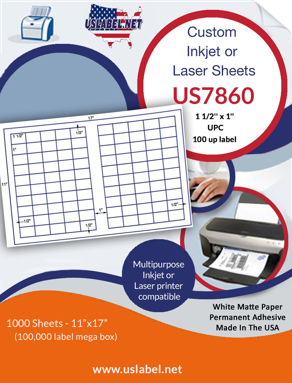 The US7860-1 1/2''x1''UPC-100 up label on a 11'' x 17''sheet. is made in America and we hope this item is what you're looking for.