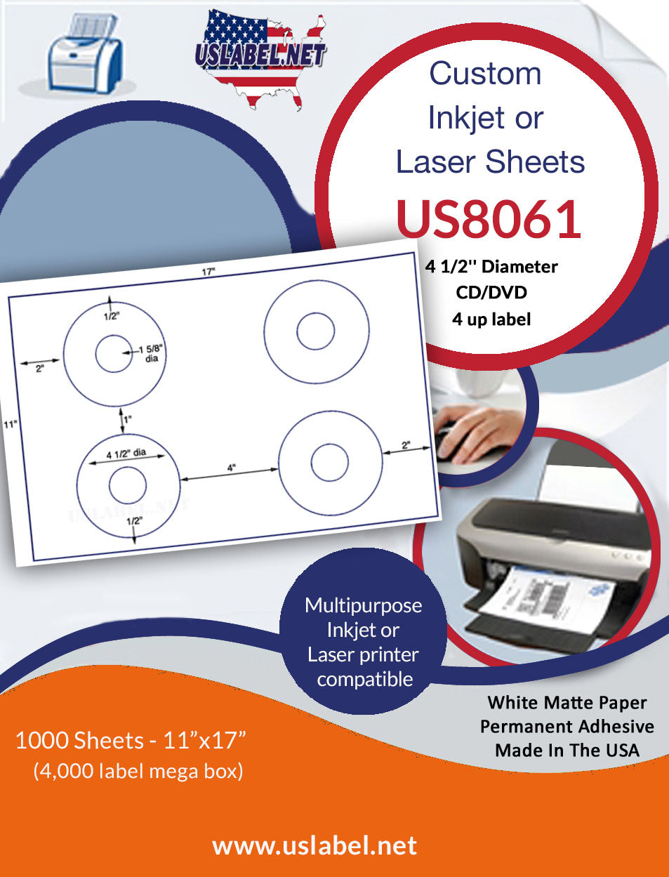 The US8061-4 1/2'' Diam. CD/DVD-4 up on a 11'' x 17''sheet. is made in America and we hope this item is what you're looking for.