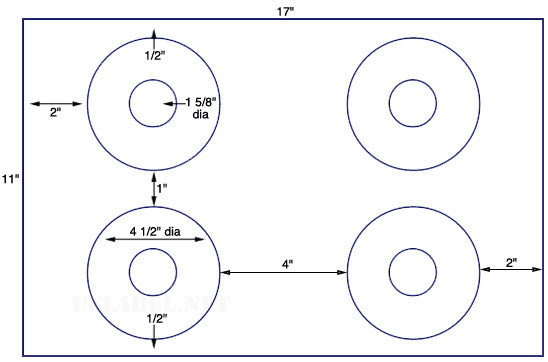 This is a 4 1/2'' Diameter CD/DVD - 4 up on a 11'' x 17'' sheet - 4,000 labels. Now available in more than 39 different label stocks. Custom Flood Coating and scoring available. Make your selection under Label & Adhesive Options.