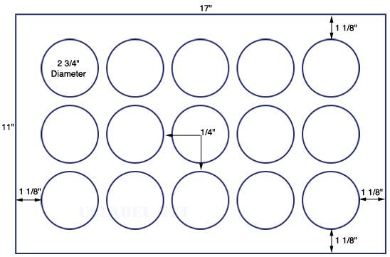 This is a 2 3/4'' circle - 15 up label on 11'' x 17'' laser sheet - 15,000 labels. Now available in more than 39 different label stocks. Custom Flood Coating and scoring available. Make your selection under Label & Adhesive Options.