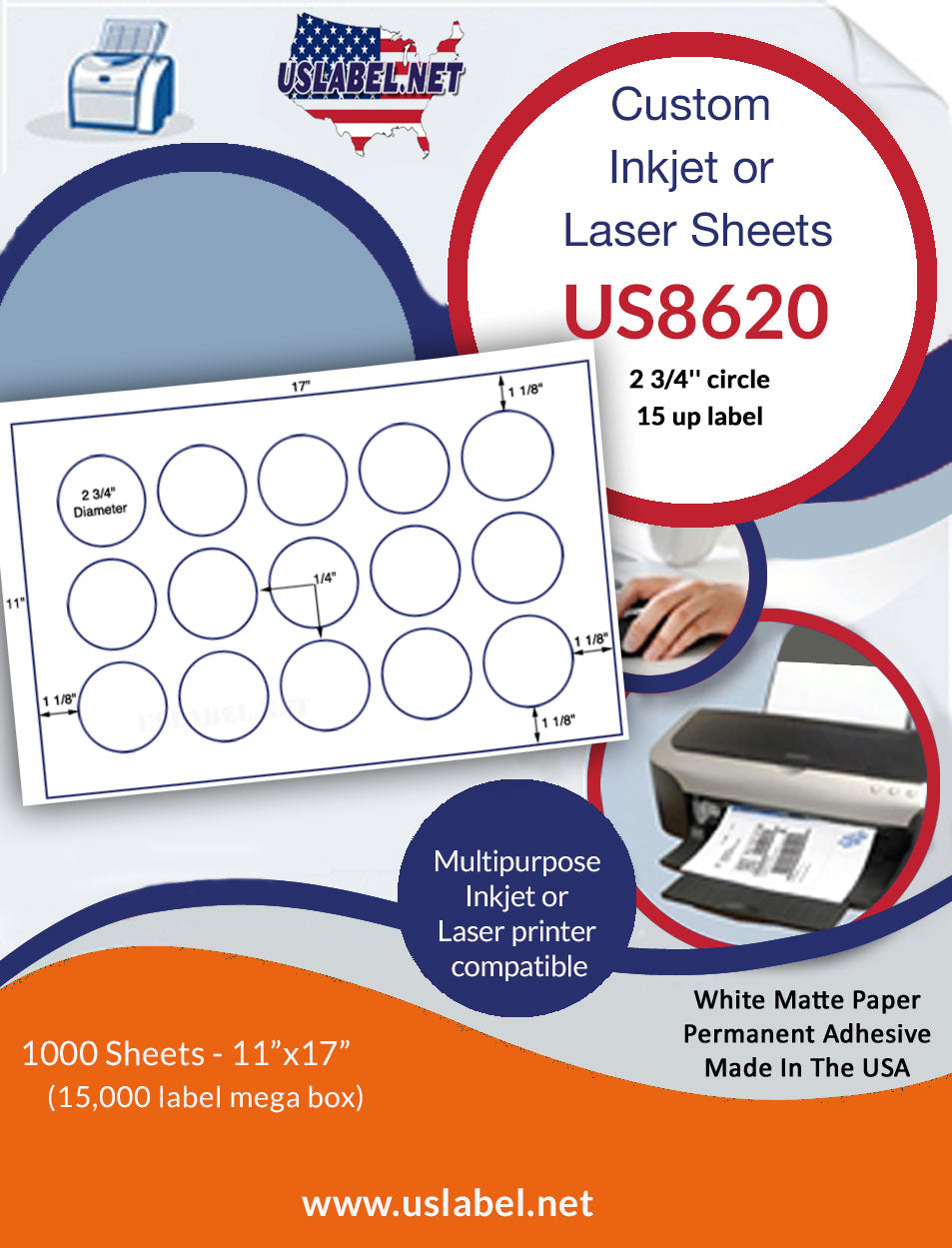 The US8620 - 2 3/4'' circle 15 up label on 11'' x 17'' sheet. is made in America and we hope this item is what you're looking for.
